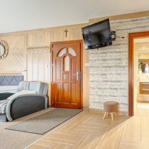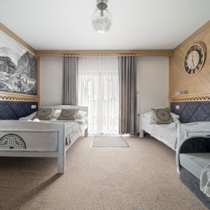 Pokój 3 osobowy Deluxe z balkonem oraz widokiem na Tatry. Wyposażony w łazienkę, tv, lodówkę, internet bezprzewodowy, czajnik, meble stylizowane drewniane.