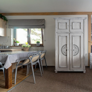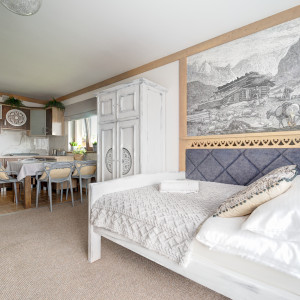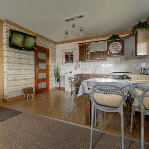 Apartament 4-osobowy z widokiem na góry składający się z 2 części (dziennej i sypialnianej). Część dzienna to aneks kuchenny (kuchenka mikrofalowa, czajnik, lodówka, zlew jednokomorowy, płyta indukcyjna) jadalnia (stół + 4 krzesła)