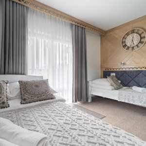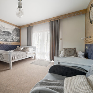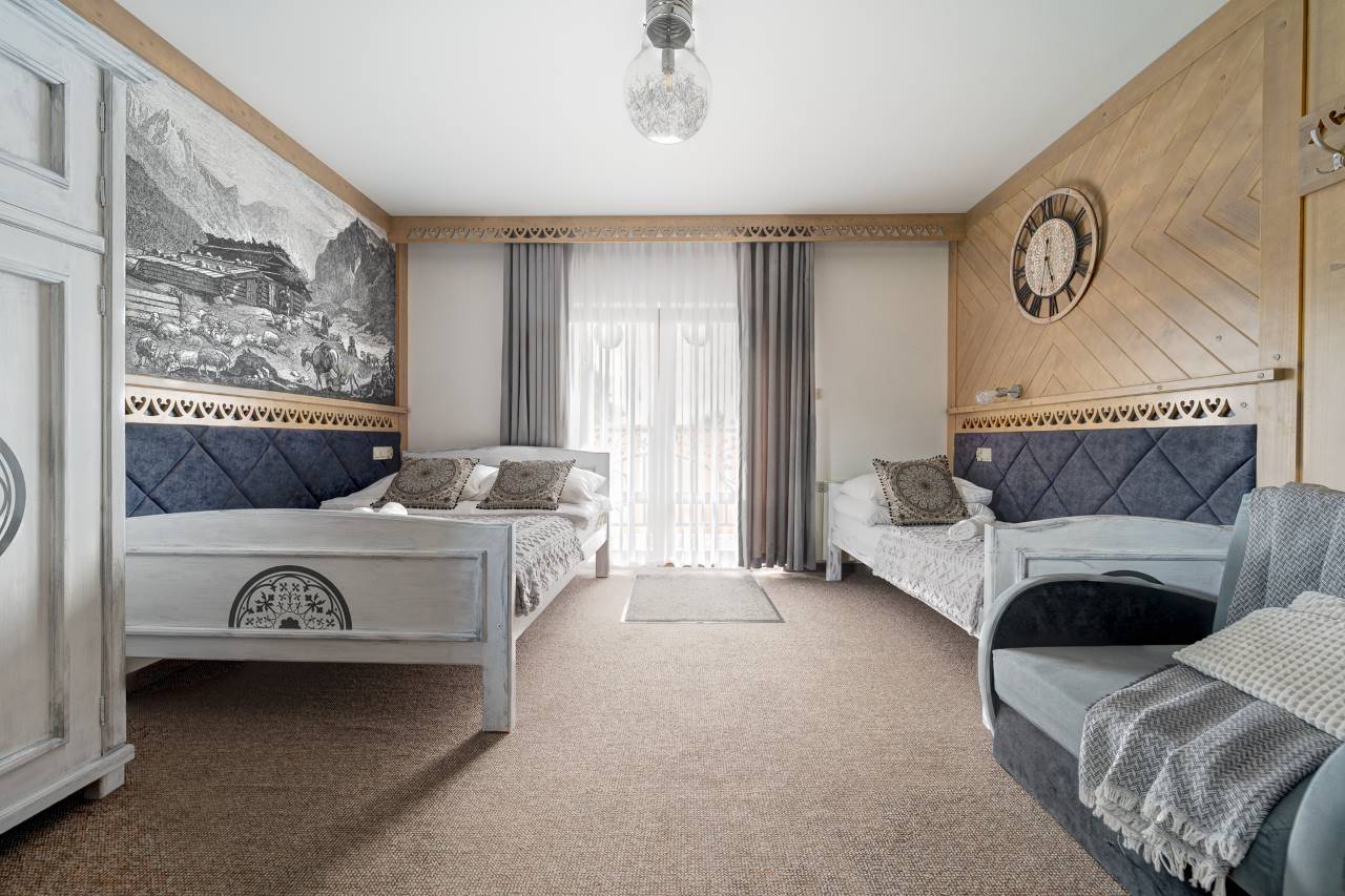 Pokój 3 osobowy Deluxe z balkonem oraz widokiem na Tatry. Wyposażony w łazienkę, tv, lodówkę, internet bezprzewodowy, czajnik, meble stylizowane drewniane.