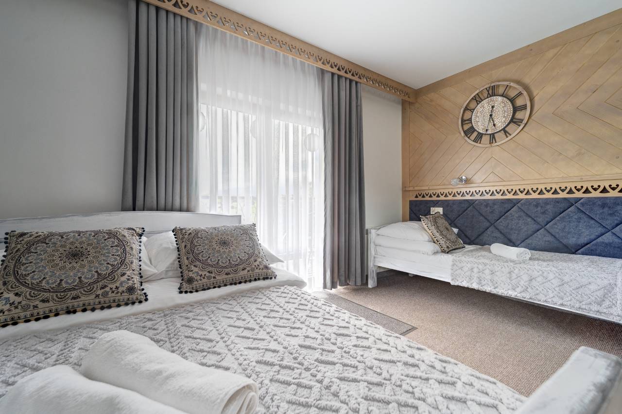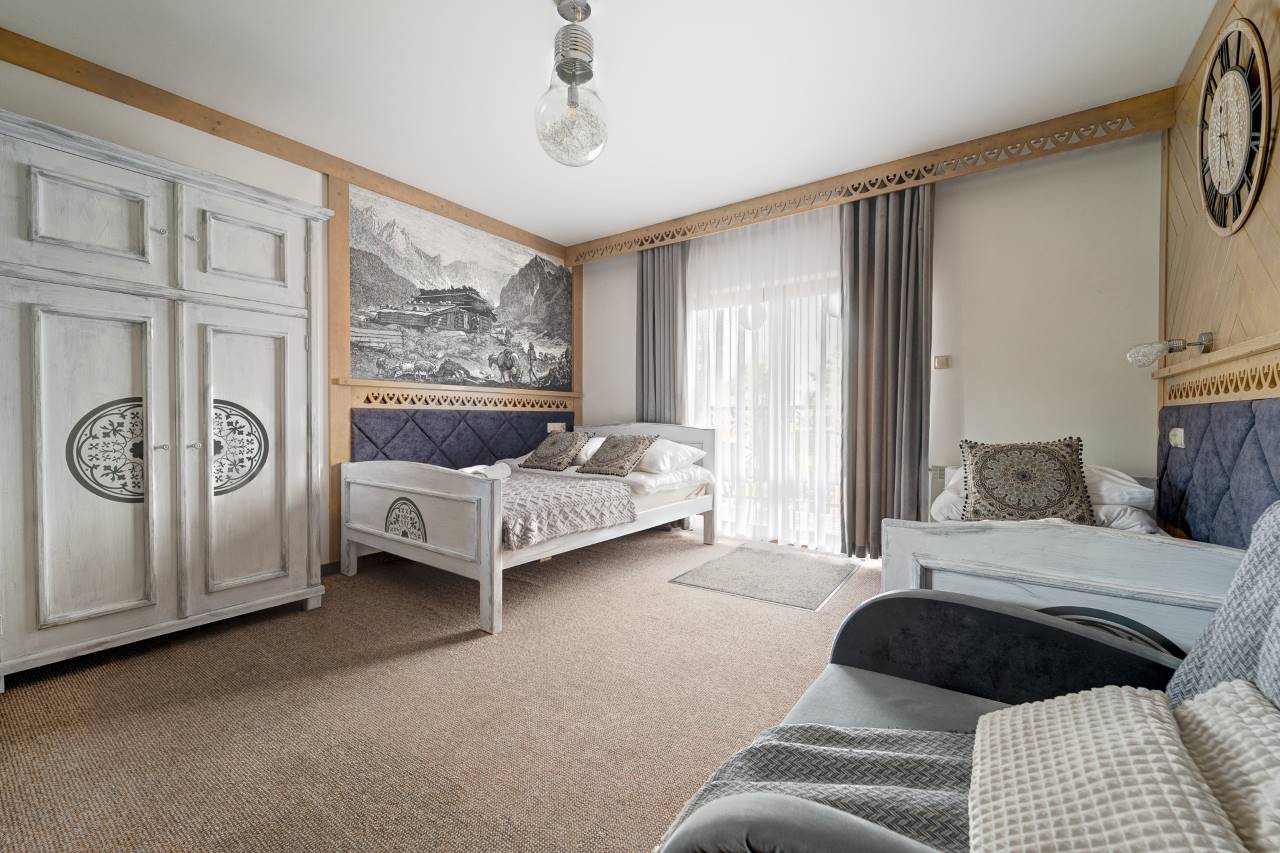 Pokój 3 osobowy Deluxe z balkonem oraz widokiem na Tatry. Wyposażony w łazienkę, tv, lodówkę, internet bezprzewodowy, czajnik, meble stylizowane drewniane.