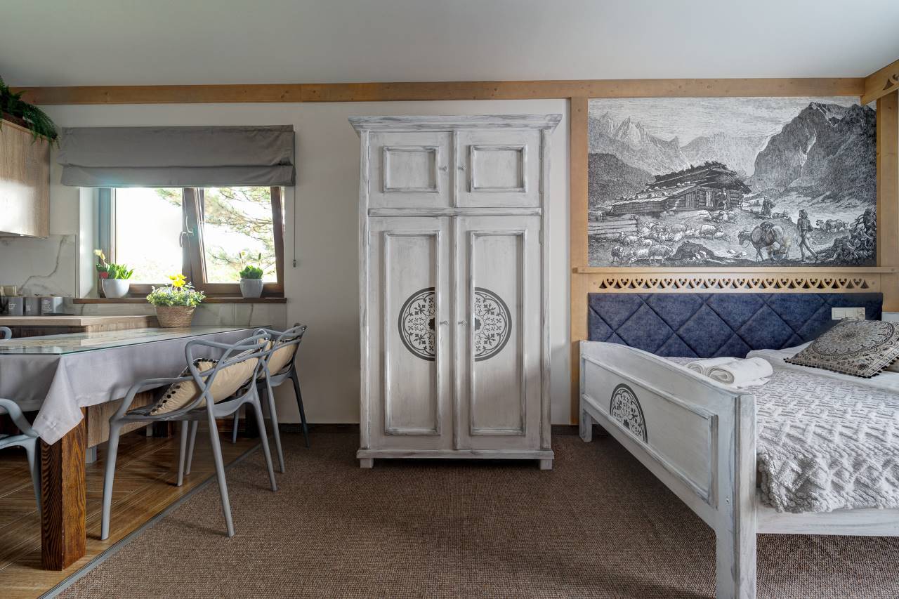 Apartament 4-osobowy z widokiem na góry składający się z 2 części (dziennej i sypialnianej). Część dzienna to aneks kuchenny (kuchenka mikrofalowa, czajnik, lodówka, zlew jednokomorowy, płyta indukcyjna) jadalnia (stół + 4 krzesła)