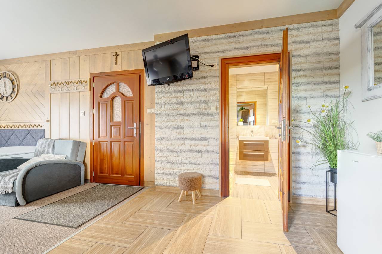 Apartament dla 3 osób, prywatne wejście. Łazienka w pokoju, aneks kuchenny w pełni wyposażony (lodówka, płyta grzewcza, czajnik, sztućce, talerze, kubki, garnki itp.). Możliwość dostawki.