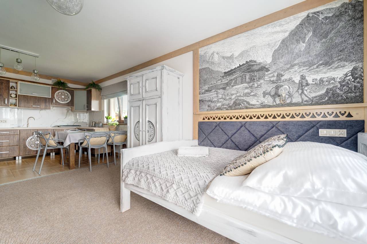 Apartament 4-osobowy z widokiem na góry składający się z 2 części (dziennej i sypialnianej). Część dzienna to aneks kuchenny (kuchenka mikrofalowa, czajnik, lodówka, zlew jednokomorowy, płyta indukcyjna) jadalnia (stół + 4 krzesła)